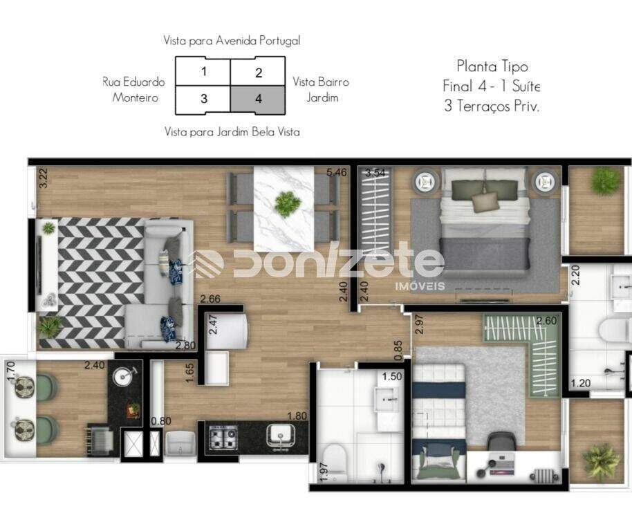 Apartamento a venda e para locação no Jardim Bela Vista em Santo AndréSeja você o primeiro morador deste incrível apartamento com 58m² de área útil, 2 Dormitórios com sacada sendo 1 Suíte, living para 2 ambientes integrado ao terraço Gourmet com churrasqueira a carvão, área de serviço e 1 vaga de garagem coberta e demarcada.Empreendimento moderno e com lazer completo com churrasqueira, piscina, playground, quadra poliesportiva, salão de festas, guarita blindada.Prédio de Torre Única, portaria 24h, gerador.Localização privilegiada próxima a Av. Portugal, Shopping ABC, Swift, Supermercados, Padarias, Restaurantes, Coco Bambu, bancos, clinicas, etc.Preço especial para investidores, confira!!!donizete imoveis