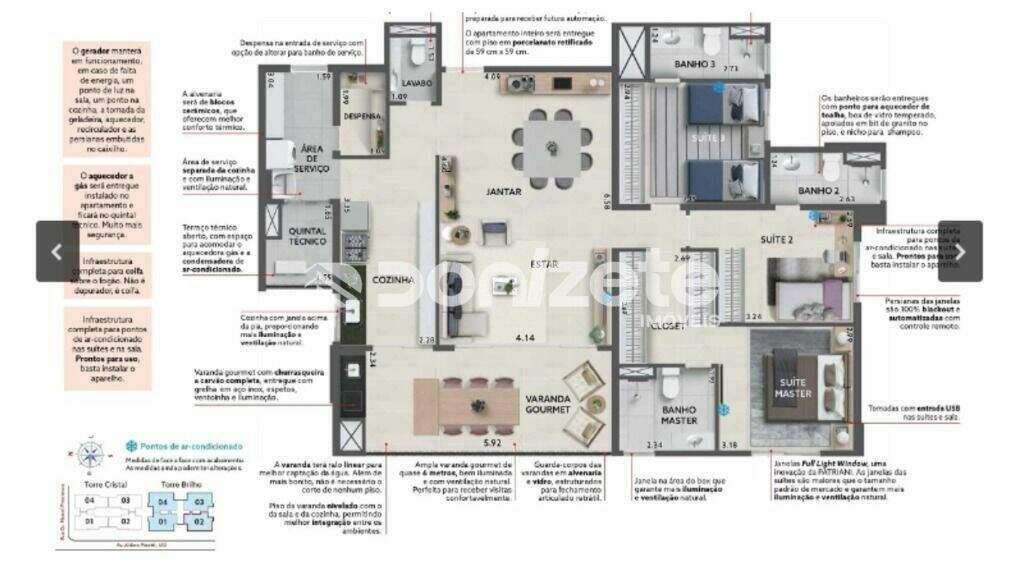 Apartamento Alto Padrão no Spettacolo Patriani - São Bernardo do Campo**Fotos ilustrativas**3 SuitesSala para 2 ambientes com varanda gourmet, churrasqueira a carvão, integrada à sala e à cozinha, com fecho em vidro temperado;Área de serviço2 vagas de garagem sendo 1 americana com depósito e a outra com preparo para elétricoPreparado para ar condicionado em todos os quartos e salaAquecedor á gásPlacas solares na cobertura do prédio** Valor de Iptu e Condomínio serão determinados quando o imóvel for entregue**Segurança e Tecnologia:Fechadura biométrica para total segurançaTomadas USB na sala e nos quartos para praticidadeSuíte com persiana blackout automaticamenteInfraestrutura completa para ar-condicionado e instalação de Câmeras em todos os cômodos;Rede hidráulica externa para manutenção facilitada;Fazenda solar, formada por placas fotovoltaicas, a fazenda solar fica no topo do prédio para captar a energia do sol e transformá-la em elétrica, proporcionando economia do consumo de energia nas áreas comuns.Ambientes Integrados:Plantas inteligentes, sem corredores, para aproveitamento total do espaço;Piso porcelanato em todos os cômodos (90x90 cm);Lazer Completo:Academia moderna, piscina aquecida, piscina coberta, arena de praia beach tênis;Salão de festas, espaço gourmet e salão de jogos para receber bem;Parque privativo, pet place, playground e quadra poliesportiva para todas as idades;Spa, sauna e sala de massagem para seu relaxamento e muito mais.Comércio no Entorno:Hipermercado Bem BaratoSupermercado Sonda e AssaíShopping MetrópoleParque das BicicletasCidade da Criança e Pinacoteca de São BernardoDONIZETE IMÓVEIS liderando o mercado imobiliario há mais de 30 anos, oferecemos mais do que imóveis, entregamos tranquilidade, credibilidade e oportunidades para clientes, investidores e parceiros.