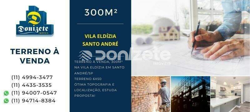 Terreno à venda na Vila Eldízia em Santo André/SP. Terreno com 300m² de área total sendo 6x50.Ótima topografia e localização, estuda proposta!Para maiores informações contate um de nossos corretores e agende sua visita. Donizete Imóveis há mais de 30 anos no mercado imobiliário. A maior variedade de imóveis e terrenos na região.